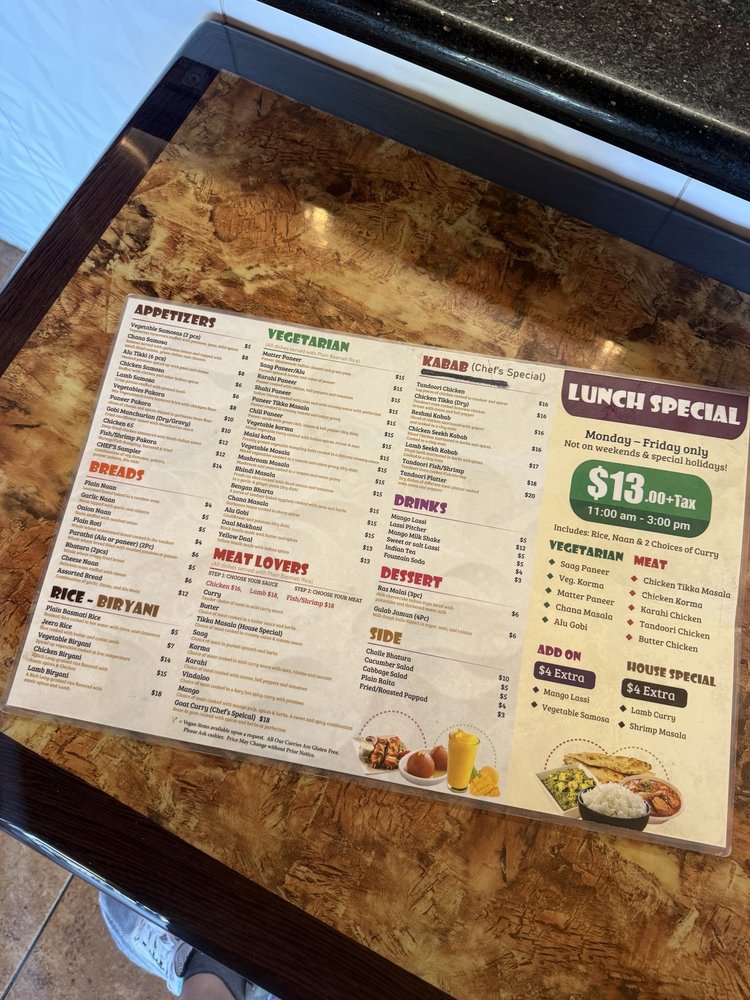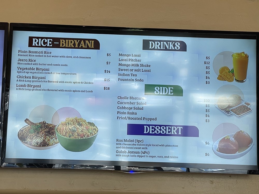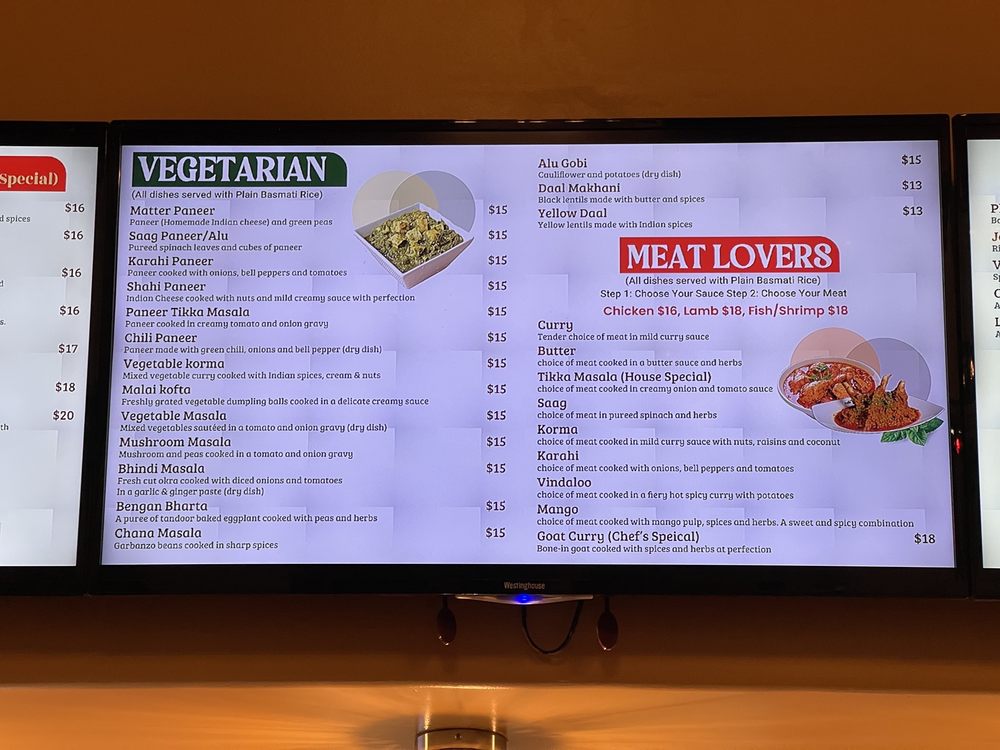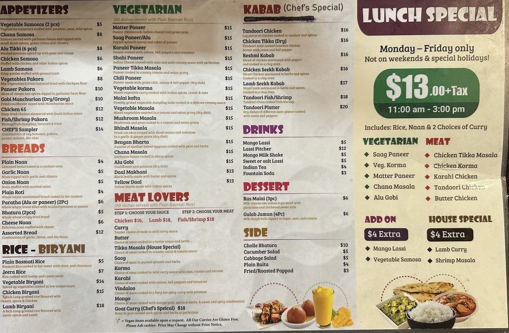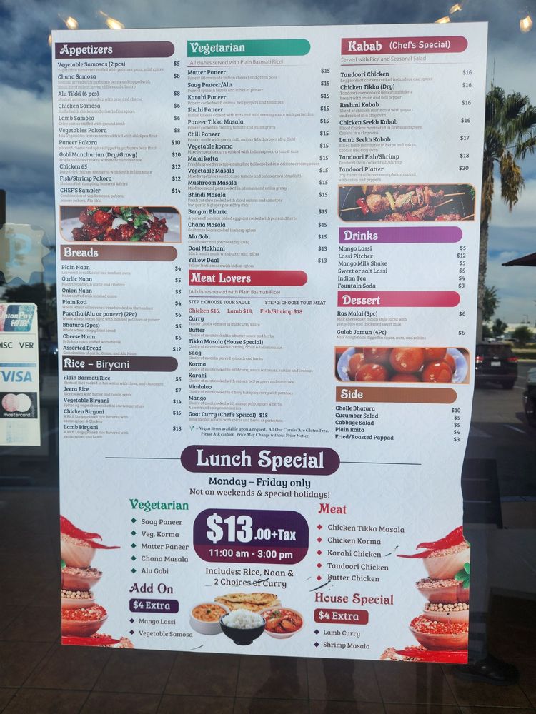 The menu boasts a tempting variety of dishes. Indulge in freshly baked breads like Cheese Naan and Garlic Naan, or savor hearty entrées such as Butter Chicken and Paneer Tikka Masala. With vegan options available, there’s something for everyone, including sides like Cabbage Salad and Plain Raita.