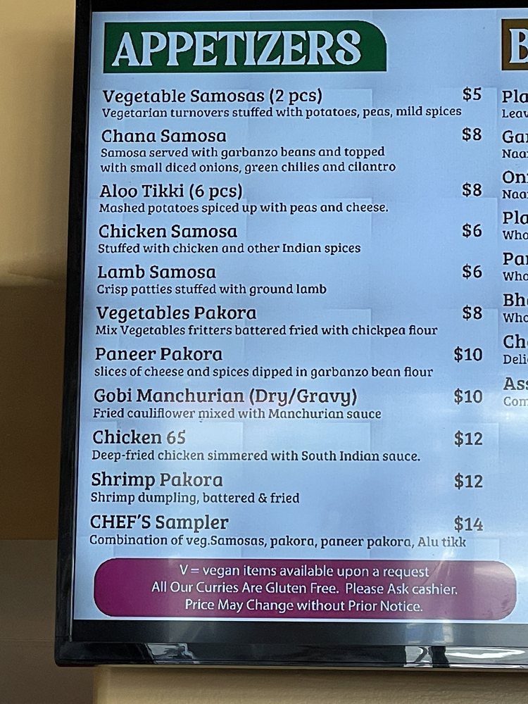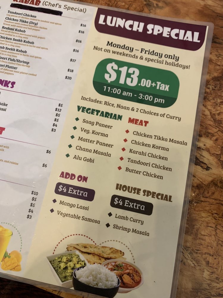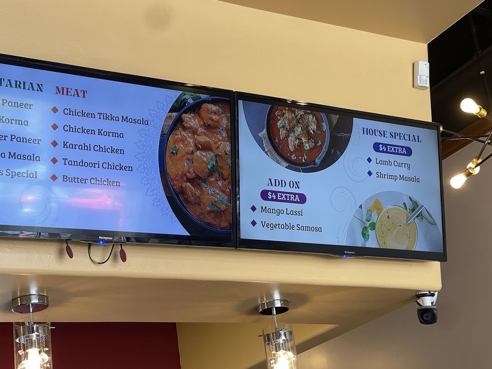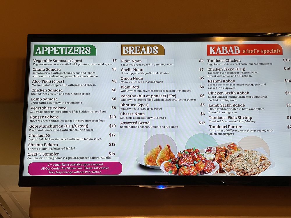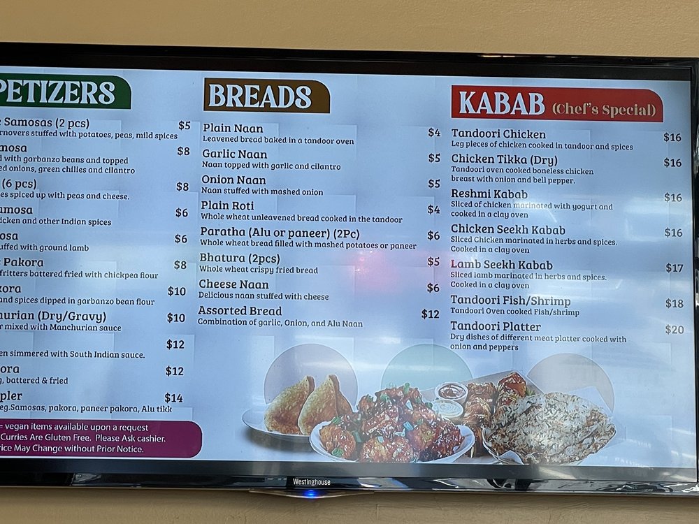 The menu boasts a tempting variety of dishes. Indulge in freshly baked breads like Cheese Naan and Garlic Naan, or savor hearty entrées such as Butter Chicken and Paneer Tikka Masala. With vegan options available, there’s something for everyone, including sides like Cabbage Salad and Plain Raita.